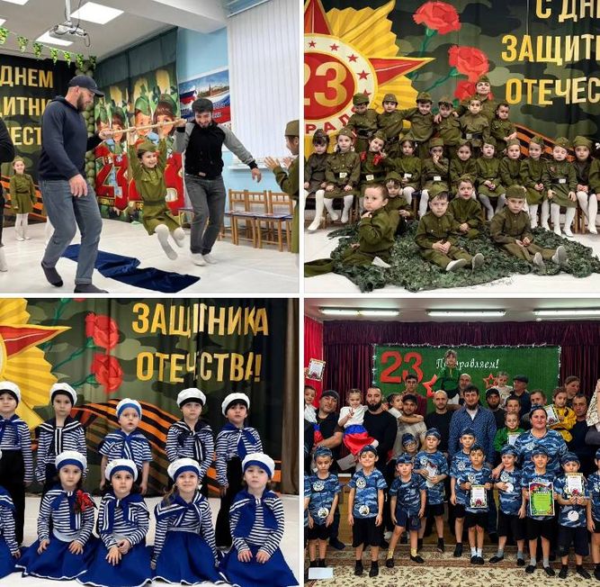 Так в детском саду «Радуга» с. Первомайское, дети вместе с папами участвовали в конкурсах и эстафетах, демонстрируя командный дух и сплочённость. Среди гостей были и дедушки. Праздник украсили творческие выступления воспитанников: стихи, песни и танцы на патриотическую тему.
