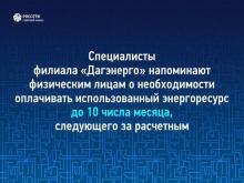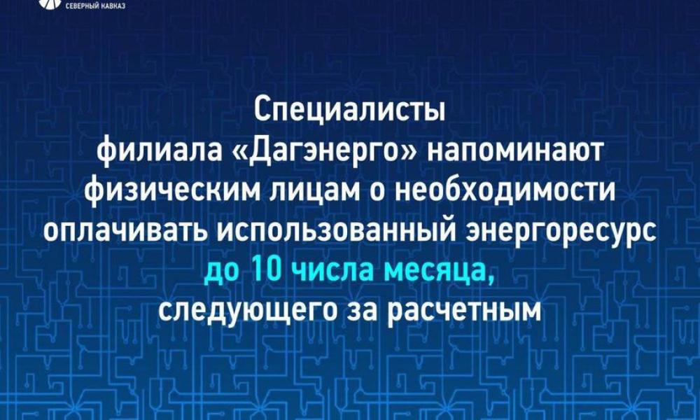 Специалисты филиала «Дагэнерго» призывают потребителей своевременно вносить плату за электроэнергию — до 10 числа каждого месяца, следующего за расчётным периодом, согласно требованиям Жилищного кодекса РФ.