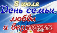 8 июля мы отмечаем один из самых добрых праздников – Всероссийский день семьи, любви и верности. Семья – главная ценность любого общества. Это крепкий дом, это дети и внуки, это наша поддержка и опора, это самое дорогое, что у нас есть. Залог семейного счастья – это создание и поддержка гармоничных, теплых взаимоотношений, основанных на доверии, уважении и любви. Крепкая дружная семья дает человеку силы, помогает в трудную минуту. От взаимоотношений в семье зависят и наши отношения в обществе. Создание полноценной семьи – дело нелегкое, но необходимое каждому.
