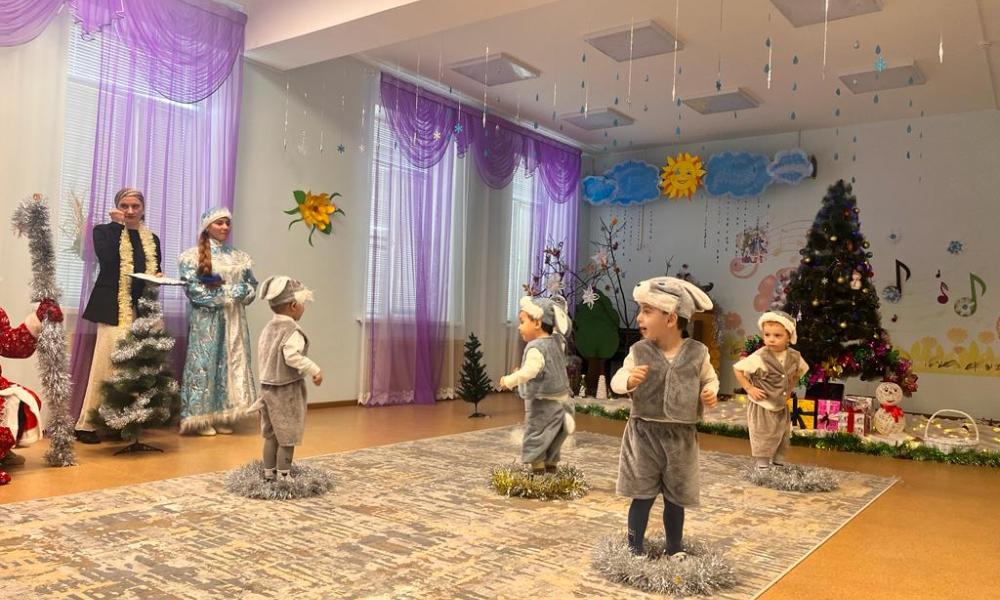 В фотоколлаже новогодние утренники в детских садах: с.Сагаси-Дейбук, Башлыкент, Новокаякент.