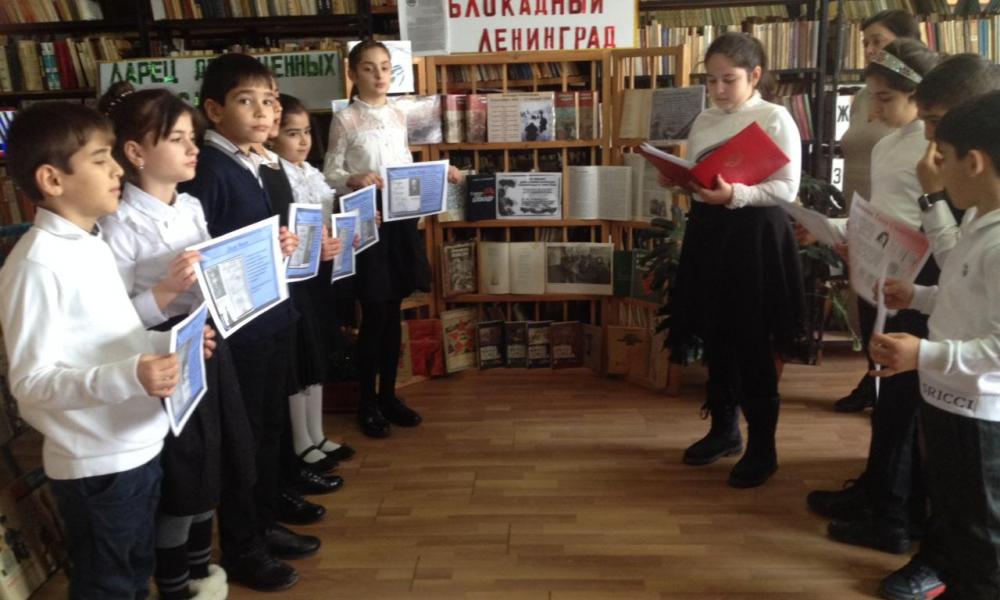 Сегодня 25.01.2019 года в районной детской библиотеке был проведён тематический час «Дети войны», приуроченный к 75 летию полного освобождения советскими войсками города Ленинграда от блокады его немецко – фашистскими войсками. Память о страшных событиях военных лет не должна угаснуть в наших сердцах (детей 60-х г.г.), наших детей, внуков и будущих поколений. Наши читатели, ученики 4-го класса школы – сад с. Новокаякент пришли к нам сегодня со своей программой.