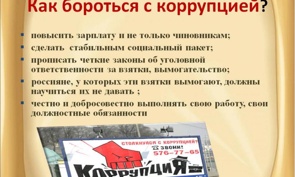 Коррупция – система, в которую тем или иным образом включается все общество, и для эффективной борьбы с ней также необходимо участие всех членов общества. Первый шаг – разработка законодательной базы-уже сделан, теперь перед всеми гражданами стоит задача отказаться от искушения «упростить» себе жизнь очередной взяткой. Коррупция-одна из главных препятствий на пути к развитой экономике и обществу, и без ее устранения не обойтись.